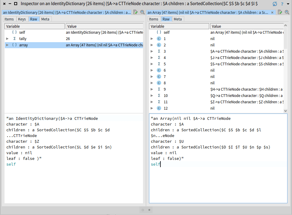 We can see that each node has an IdentityDictionary with a Character as key and a CTTrieNode. This creates the structure of nodes that we have in the Trie. From this, we can explain the number of instances of IdentityDictionary… but where are all the arrays and associations? They are taking 55% of the memory, so we have to find them.
