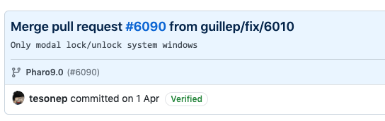Once we have the commit, the next step is to look for it in git in your favorite tool: the command line, iceberg, any external GUI based git tool, or even github. Since there are no integrations in Pharo that are not pull requests, each build commit will effectively be a PR merge commit. In our real bug example, the problematic commit was this one, which was the integration of a PR I did myself ( π ).